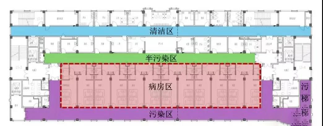 醫(yī)院四周為傳染病隔離區(qū),有30米-50米,集中于傳染病病人隔離區(qū)。為了降低感染風險,住院樓醫(yī)院建筑平面被迫分為潔凈區(qū)、半污染區(qū)和污染區(qū)三個區(qū)域,每個區(qū)域都獨立分隔。采取不同的隔離措施和不同的布局為不同的功能室和不同的感染源。