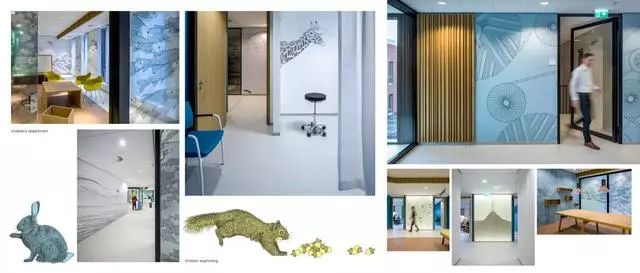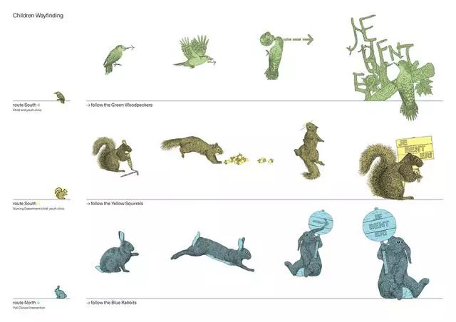 這個(gè)醫(yī)院還特別為孩子們?cè)O(shè)計(jì)了一套圖形導(dǎo)視系統(tǒng)。循著綠色啄木鳥(niǎo)、黃色松鼠和藍(lán)色兔子的腳印,去到一個(gè)個(gè)不同的醫(yī)療單元時(shí),看病的心情或許會(huì)完全不一樣了吧。