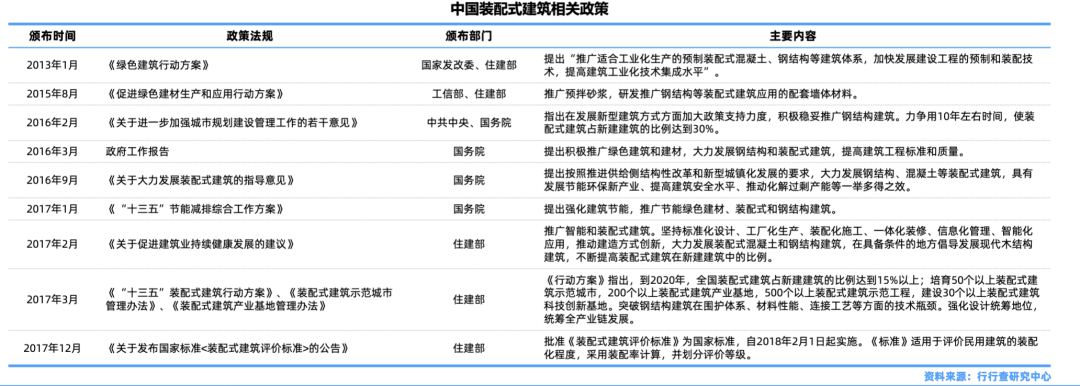裝配式建筑作為房建的細分領域,產(chǎn)業(yè)鏈覆蓋廣泛。在政府頂層設計引導下,裝配式建筑設計、施工、構件生產(chǎn)、塔吊租賃、裝修以及內(nèi)裝部品等各環(huán)節(jié)均有望迎來發(fā)展機遇。