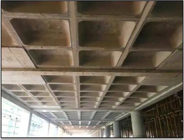 主體結構內堅外美,梁柱節點棱角清晰。本工程在管線集中的公共區域,在結構設計階段就提前考慮了降低主體成本和空間優化在醫療街部位首次采用了9500m2雙向密肋梁樓蓋板,采用成品塑料模殼作為胎模,有效減少了樓板的混凝土量與樓板自重;增加室內凈咼與柱網跨度,在標準層咼范圍提咼了各專業吊頂內施 工空間,整體性能好、剛度大、抗震性能好;同時還起到隔聲、隔熱的作用,以不增加造價和實用性為選用原則。