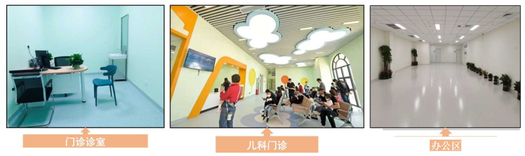 兒科區域天空、地面云朵、墻面城堡卡通造型設計,烤漆板,鋁方通、地膠、玻纖壁布搭配,效果溫馨,不同材料色彩運用,盡顯人性化設計。診室、辦公區墻地面裝飾簡潔明亮,干凈舒宜,地面PVC地膠,墻面玻纖壁布,耐磨耐用,抗污效果好,容易清潔,質感柔和,色彩豐富,選擇面廣。