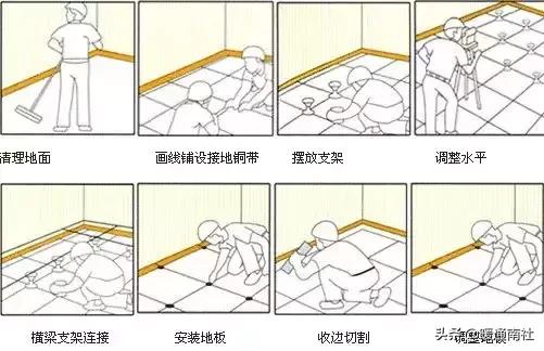 基層處理與清理->定位放線->粘貼導電銅帶->安裝固定可調支架和橫梁->鋪設活動地板面層->防靜電接地->竣工清理